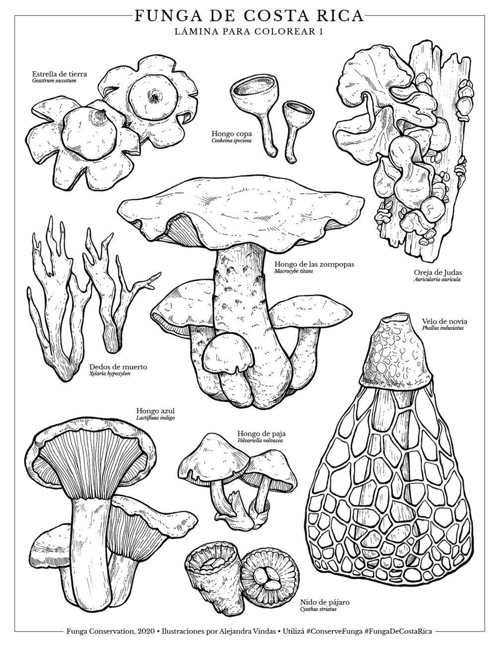 Ilustración realizada por la artista costarricense Alejandra Vindas, para pintar junto a la familia, amistades o por cuenta propia. Todo para aprender más sobre la funga de Costa Rica.